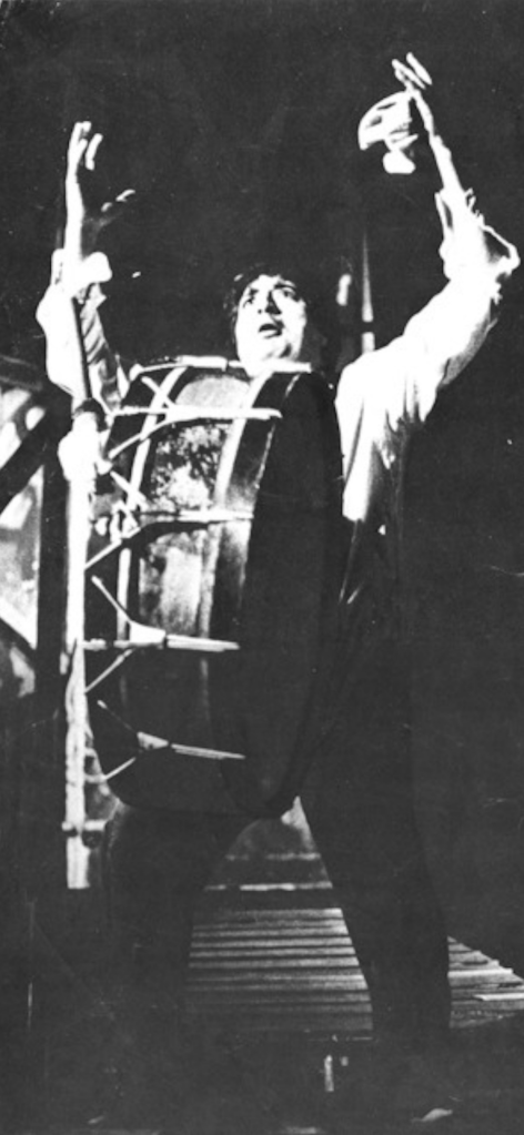 Además, el sonido del bombo ejecutado en escena le impartía un acentuado ritmo a esos desplazamientos, y lograba un impactante efecto por su alto volumen en un espacio cerrado .